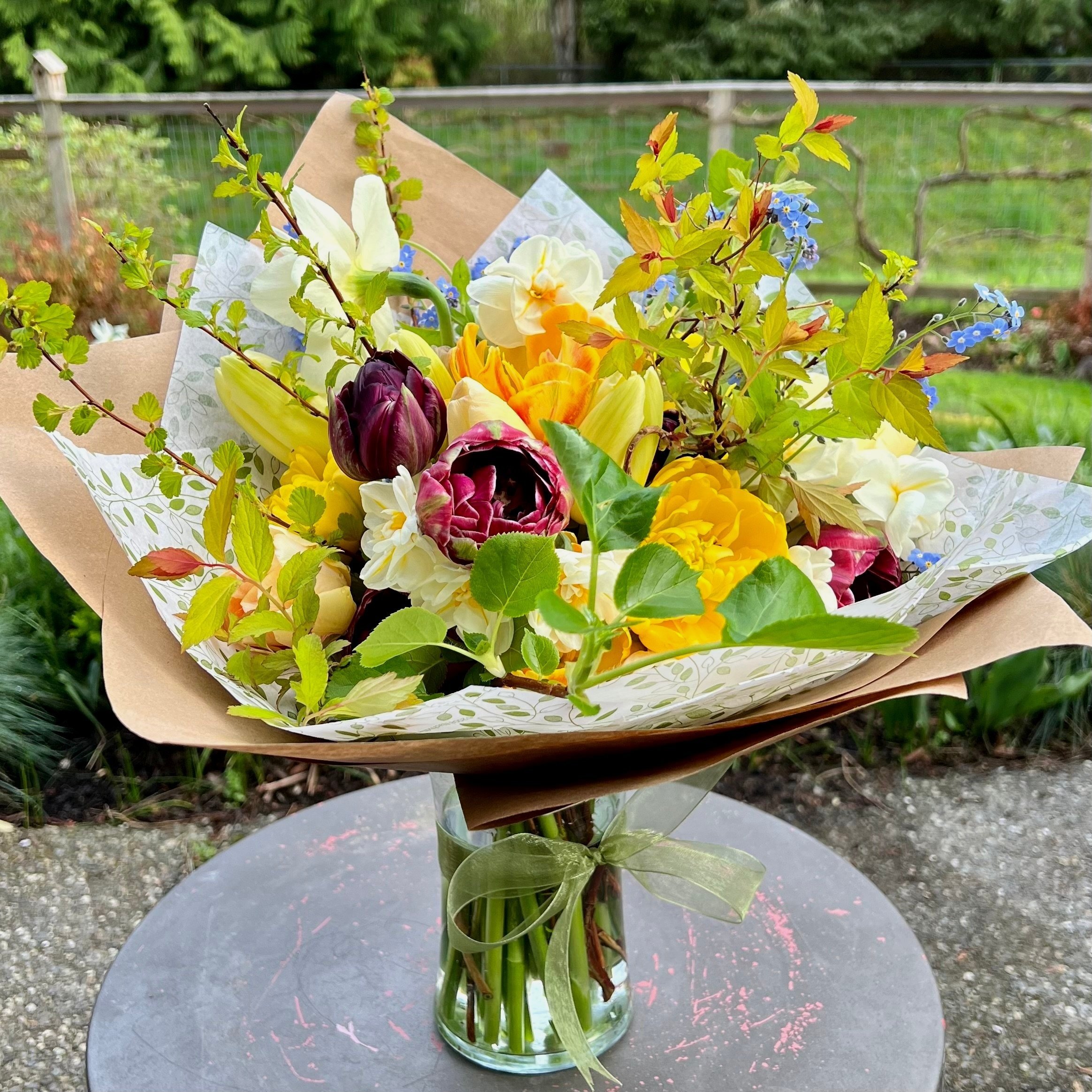 Available in Standard and Luxe sizes, these beautiful European hand-tied garden bouquets feature a variety of seasonal blooms and foliage arranged in a classic spiral technique and tied off with natural jute or raffia. They are then wrapped in tissue and craft paper for protection, and presented in a glass vessel with water, along with a personalized notecard with your message. Price includes local delivery within Bellingham.