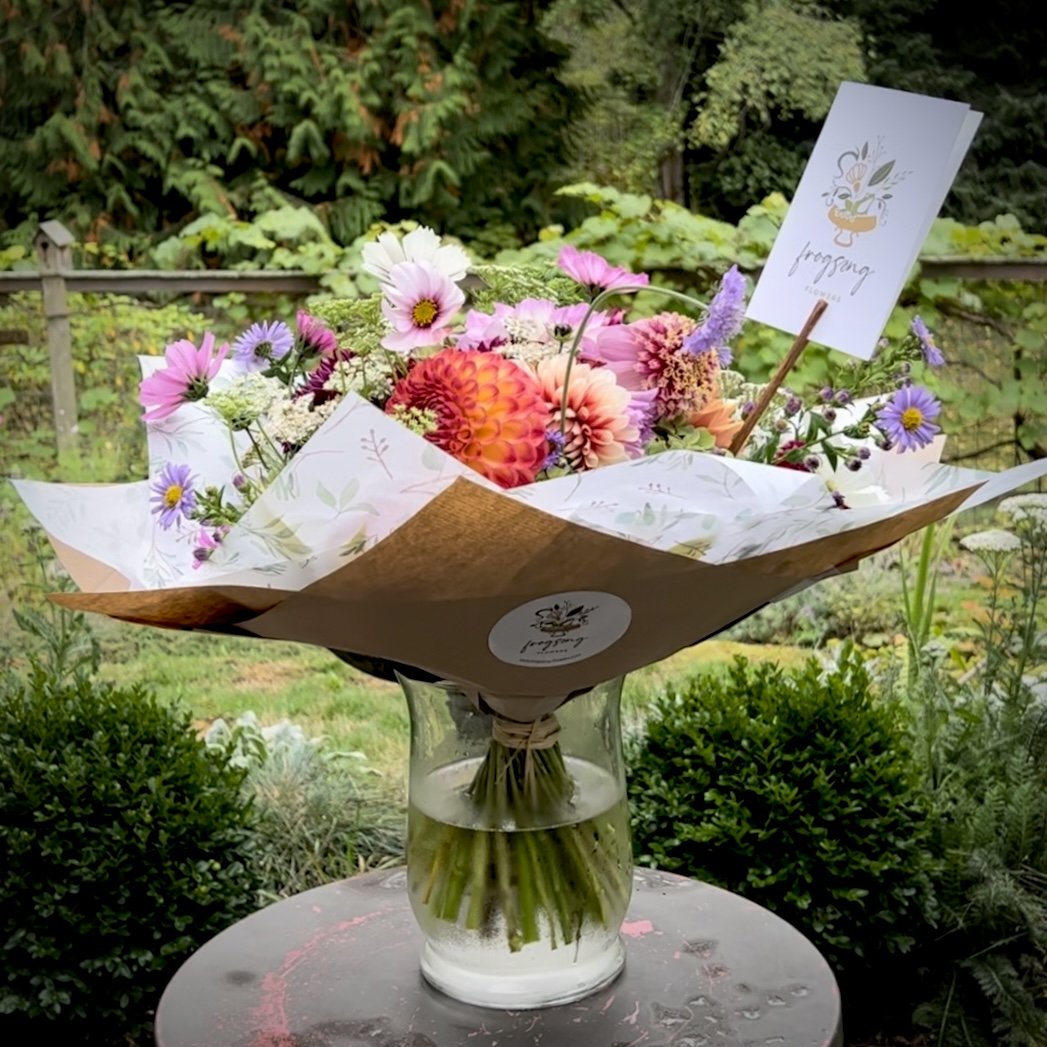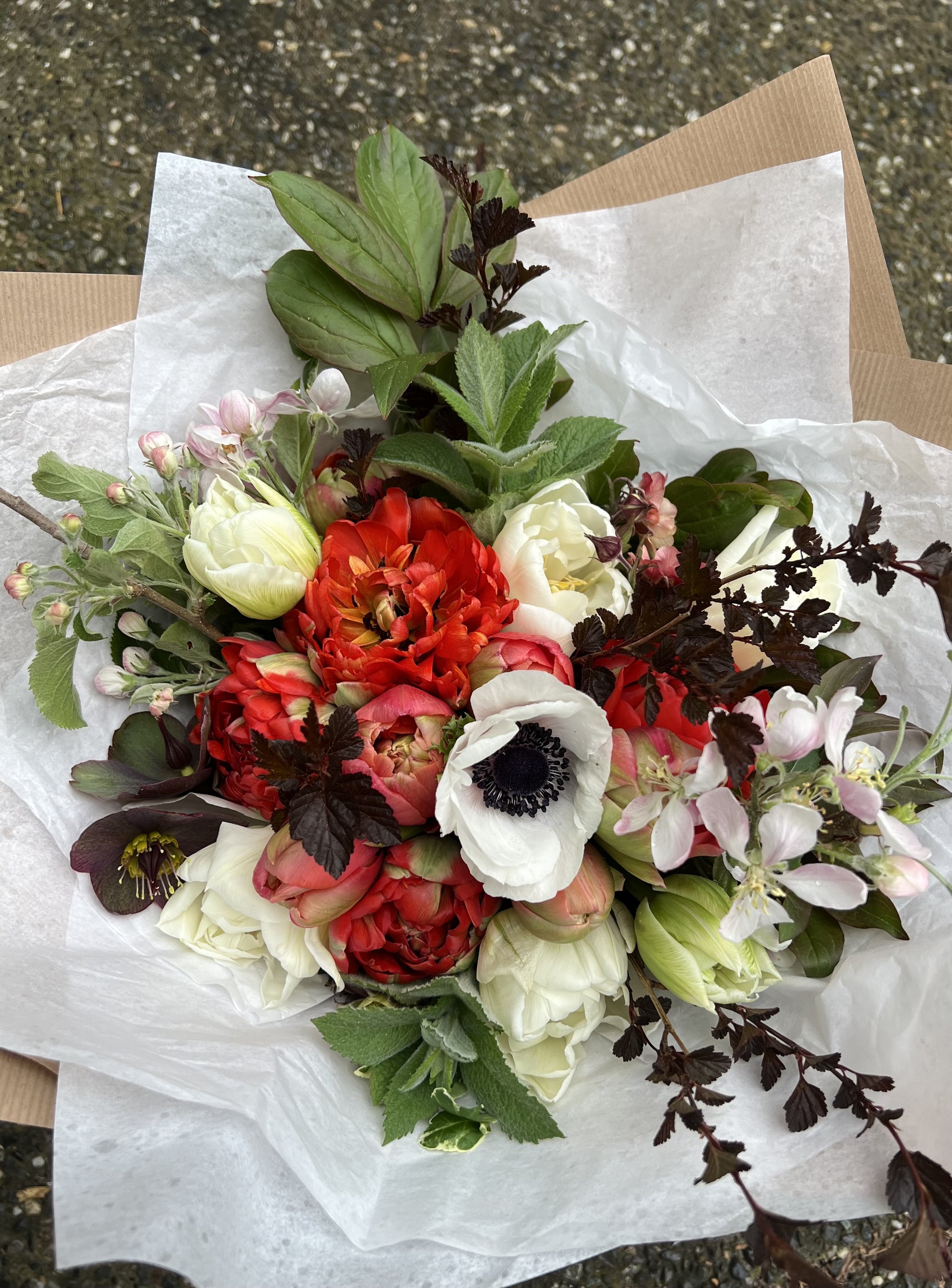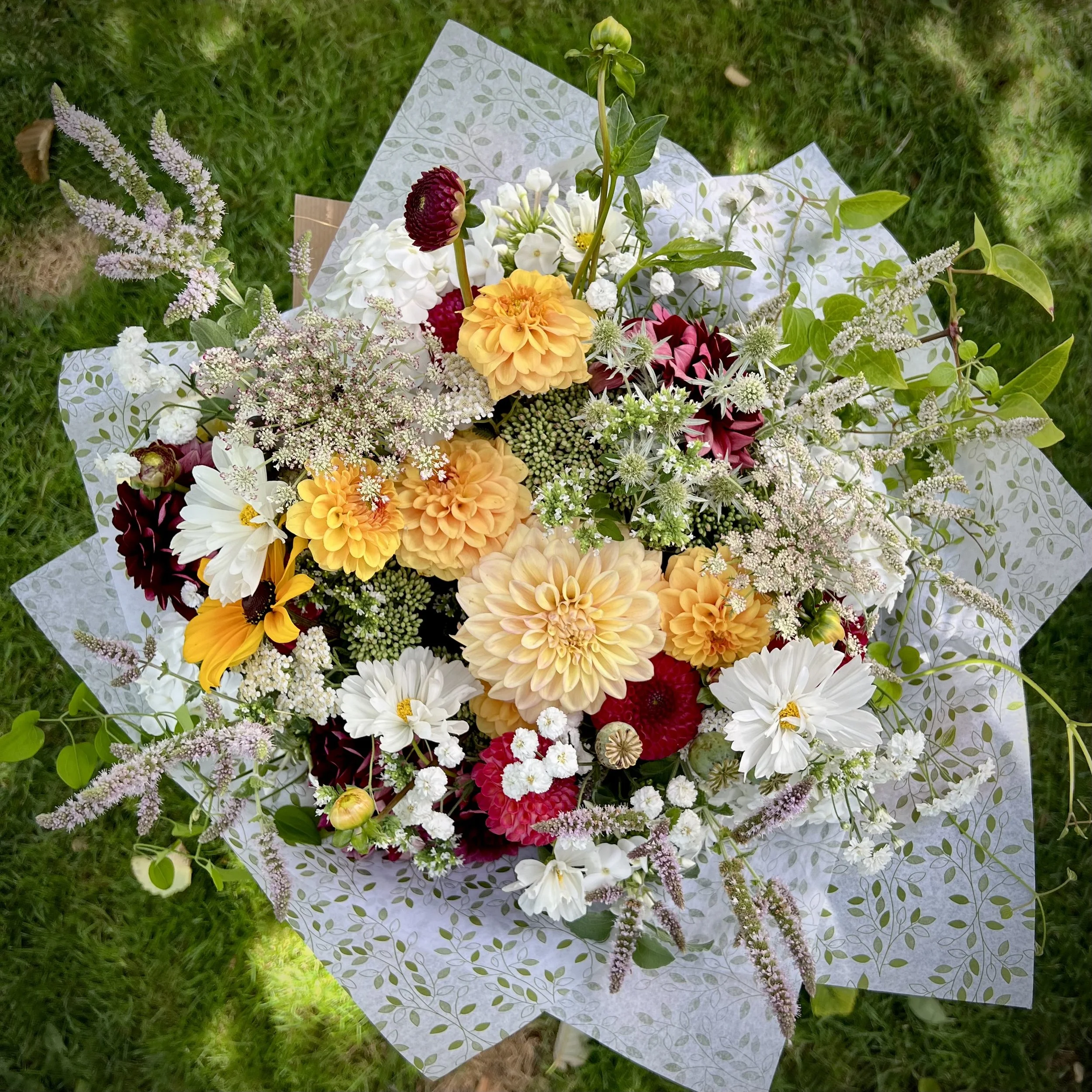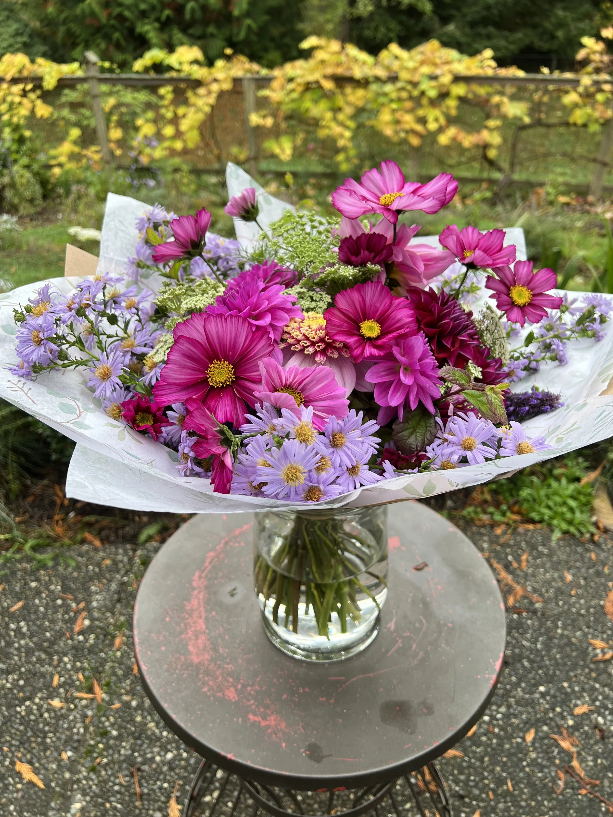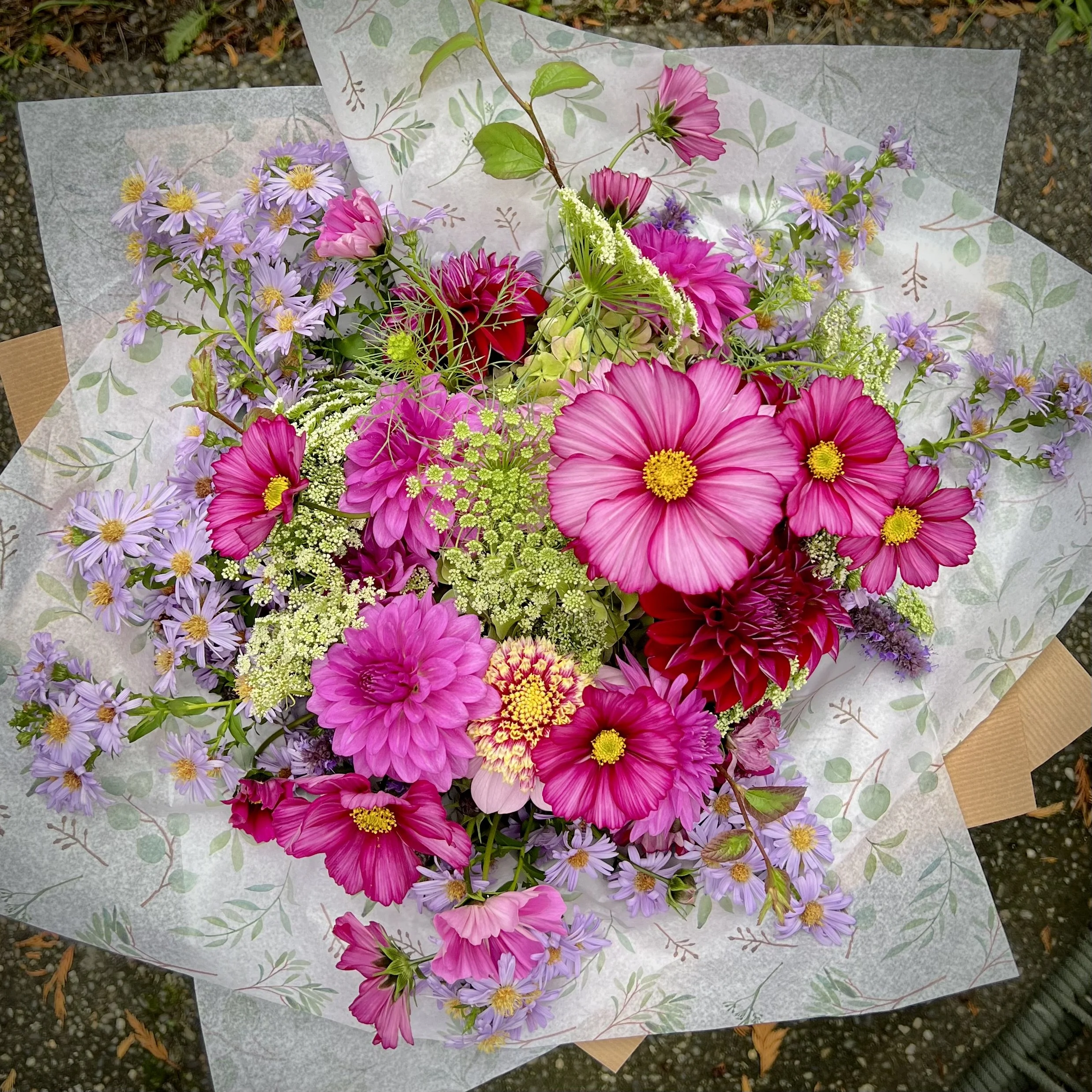 Photos are samples from across seasons— bouquets are typically “gardener’s choice” —created with the very best blooms available at the time of order. If you have a specific color palette or variety of flower in mind, please add to the Note at check-out and every effort will be made to accommodate special preferences.