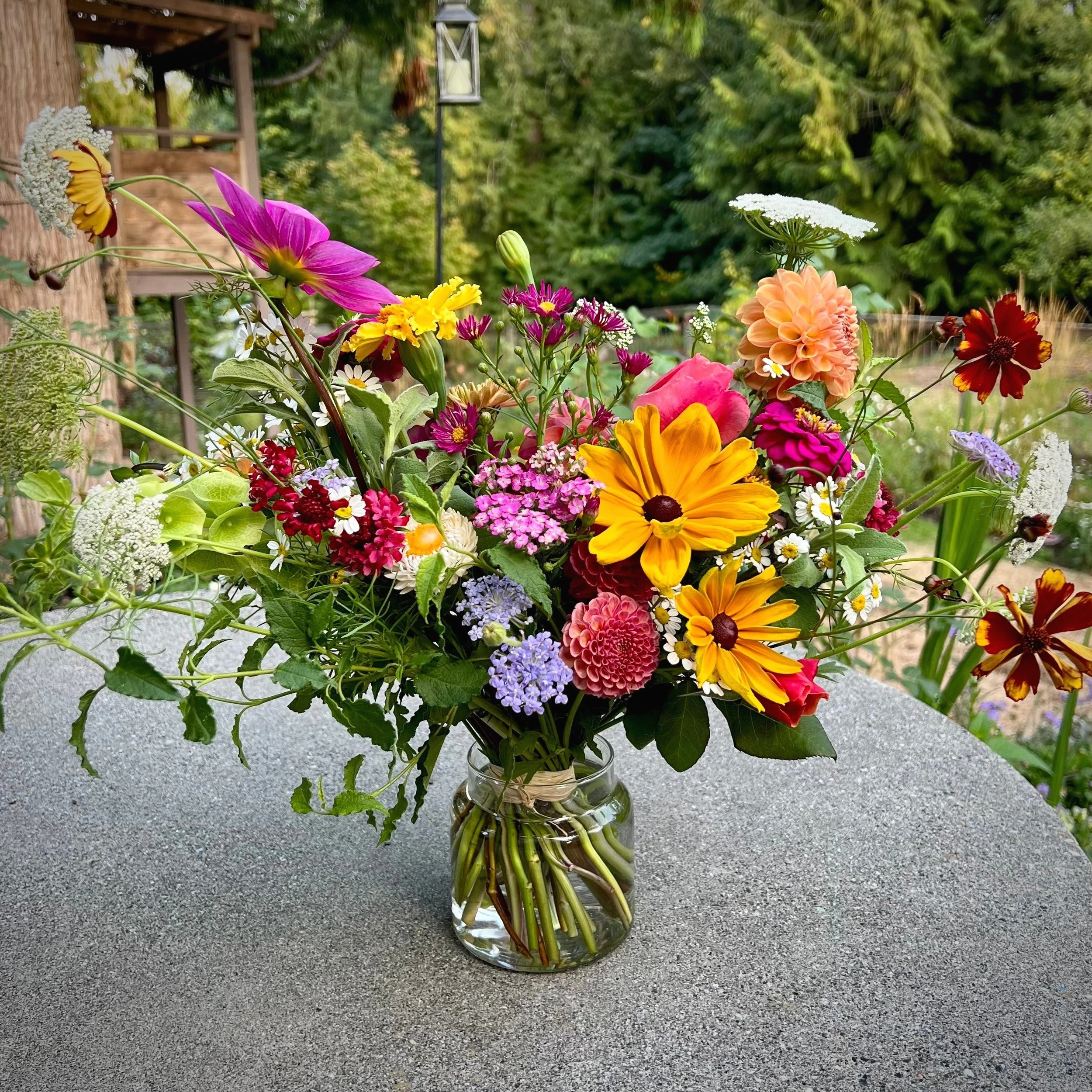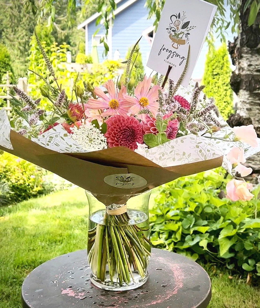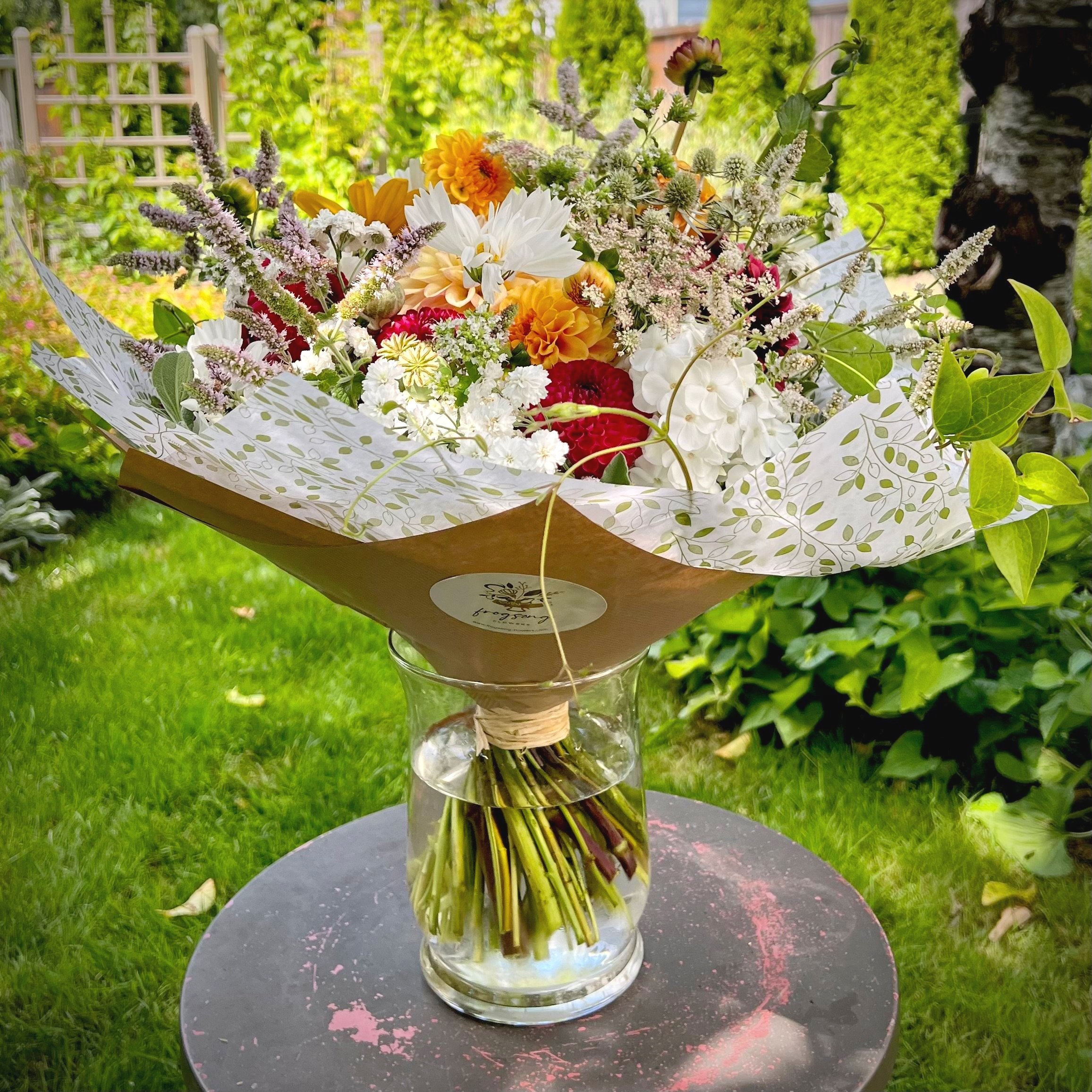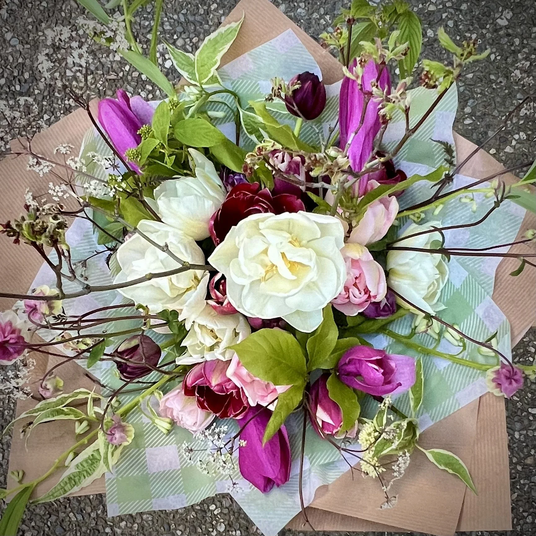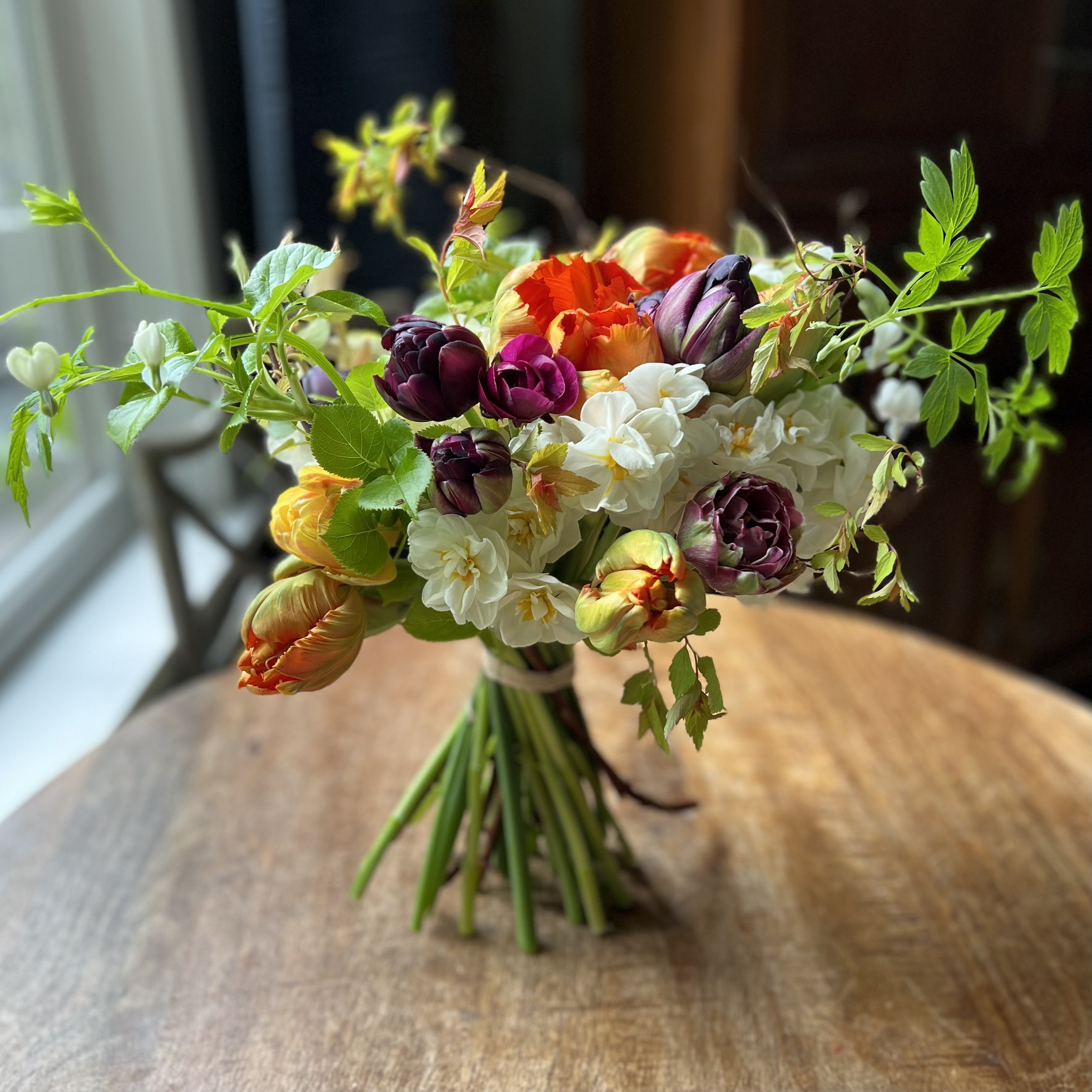 Photos are samples from across seasons— bouquets are typically “gardener’s choice” —created with the very best blooms available at the time of order. If you have a specific color palette or variety of flower in mind, please add to the Note at check-out and every effort will be made to accommodate special preferences.
